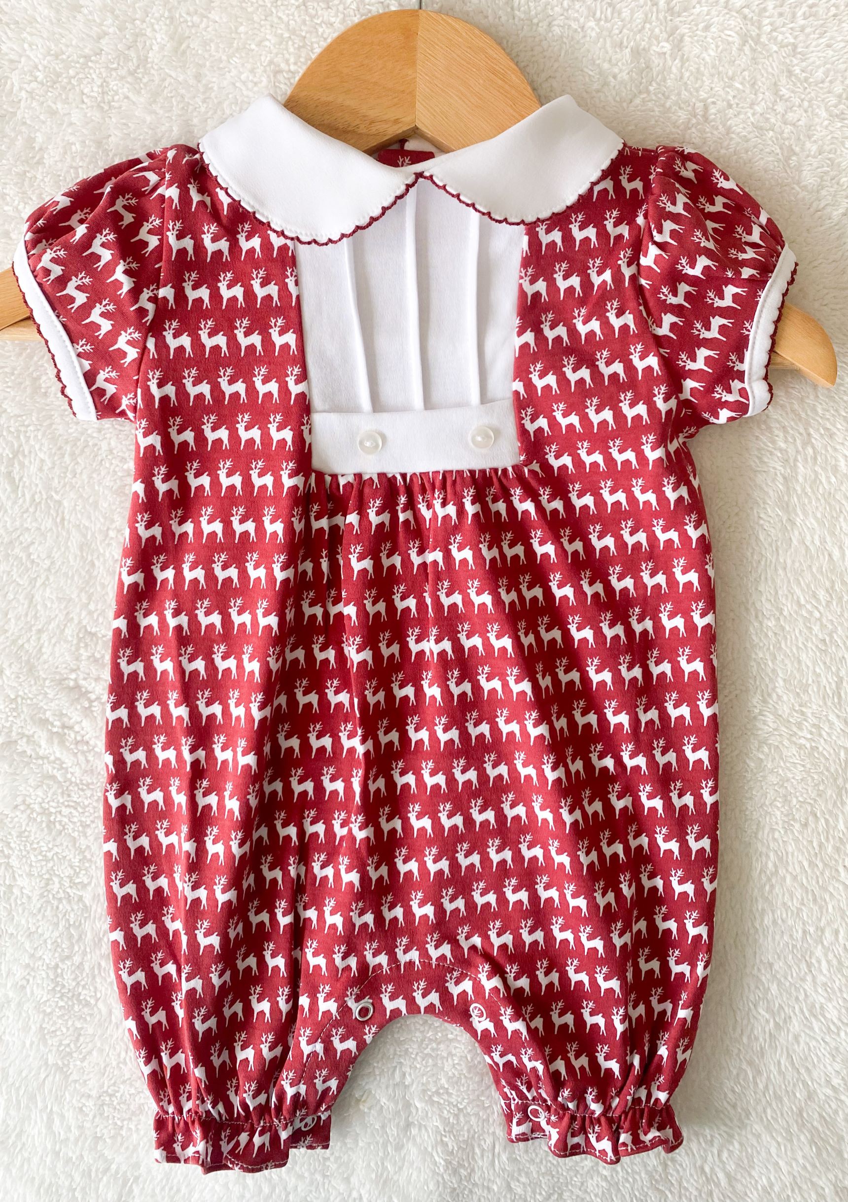 Macacão curto com estampa de rena vermelho e fechamento de botões em Algodão Pima