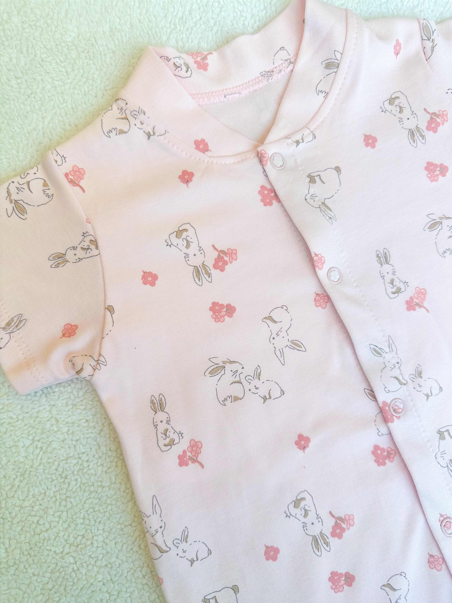Macacão curto em algodão pima rosa com estampa de coelho