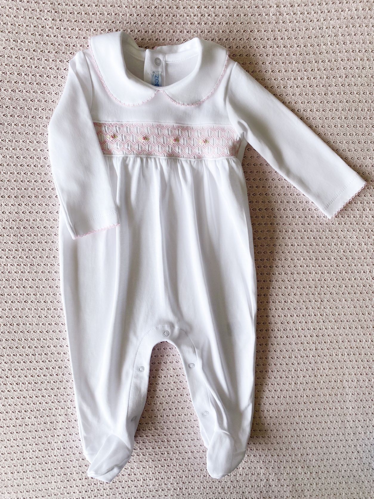 Macacão em algodão Pima rosa com bordado de casinha de abelha